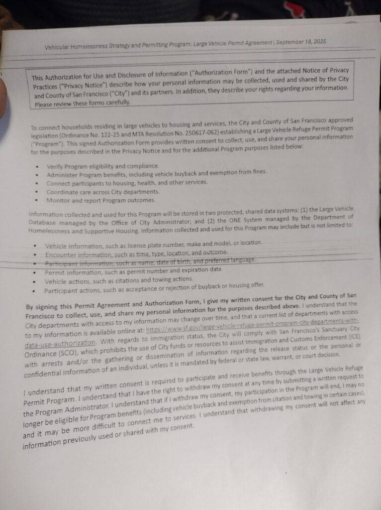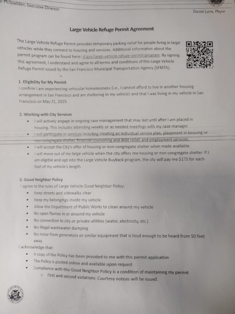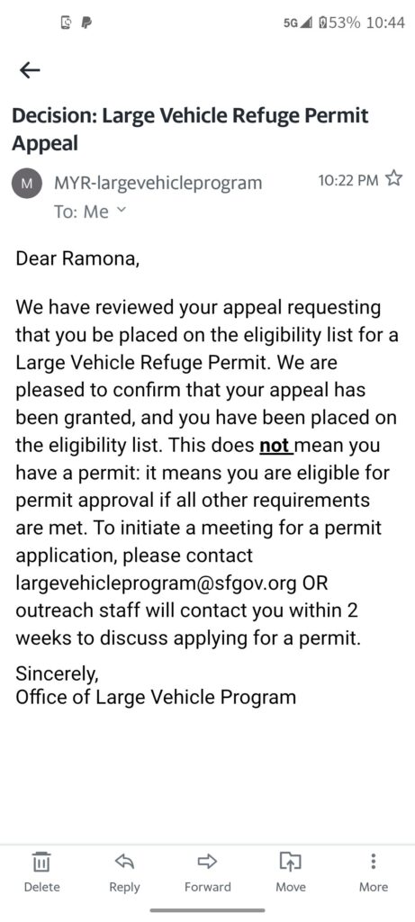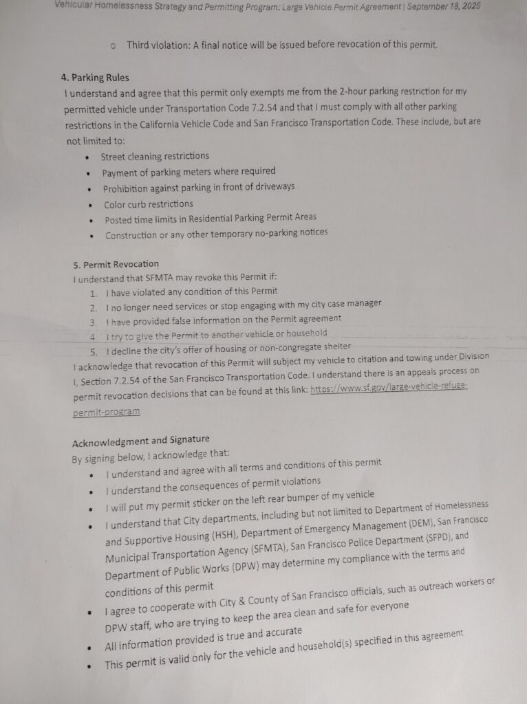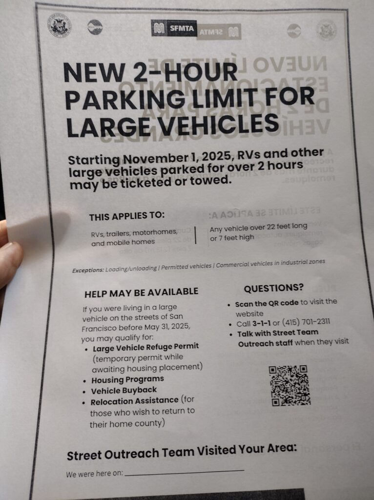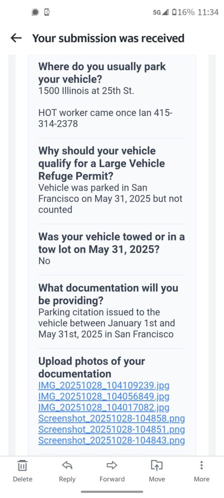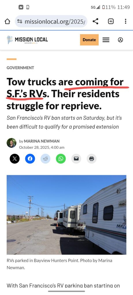 The new “Refuge Permit” program that the Dept of Homelessness/ SFMTA is “offering” is only for 437 of us here in month of May 2025 (counted by the police and put into a secret database they share). The email I got back once the website was (finally) up says I’m not on the list for a “Refuge Permit”. I appealed on Sept 29, 2025 and have heard not a word. I can prove RV was here month of May with several tickets, a 72-hour notice, and two FILMS of it being driven with street names showing. Yet I’m told in email that I’m not on the list for a “Refuge Permit” and they “strongly suggest” that I find “alternative parking arrangements “.