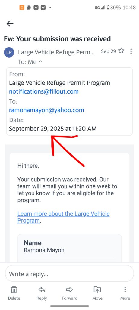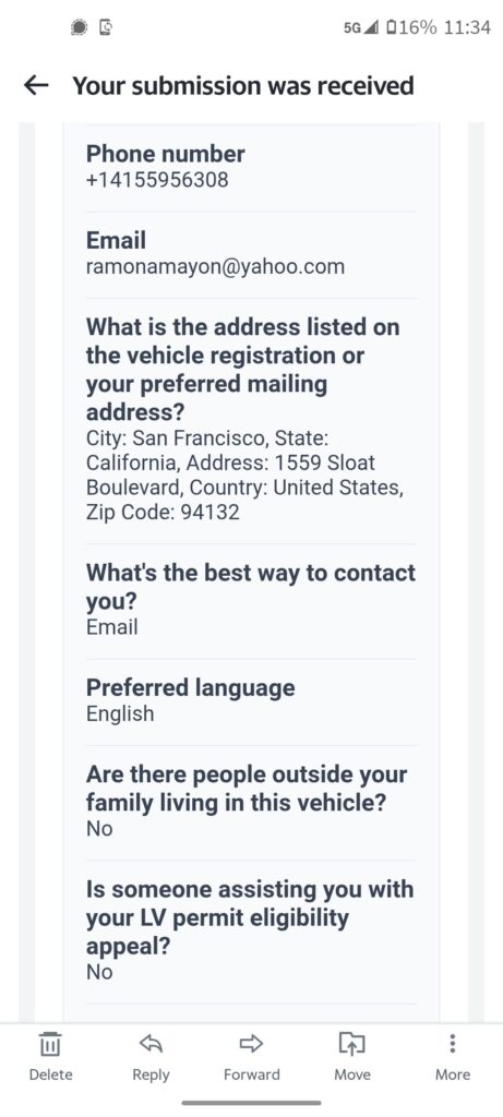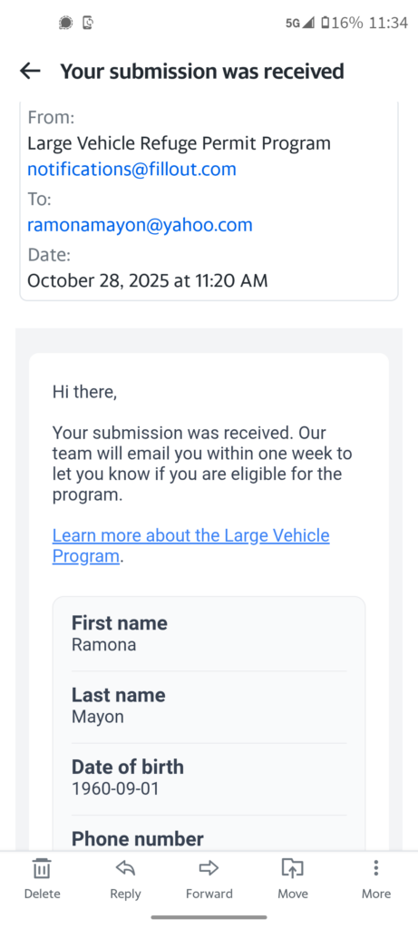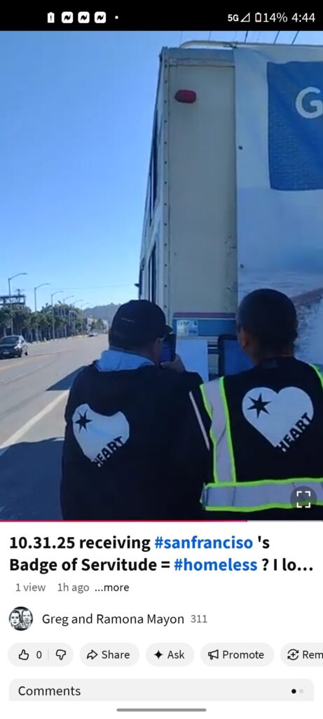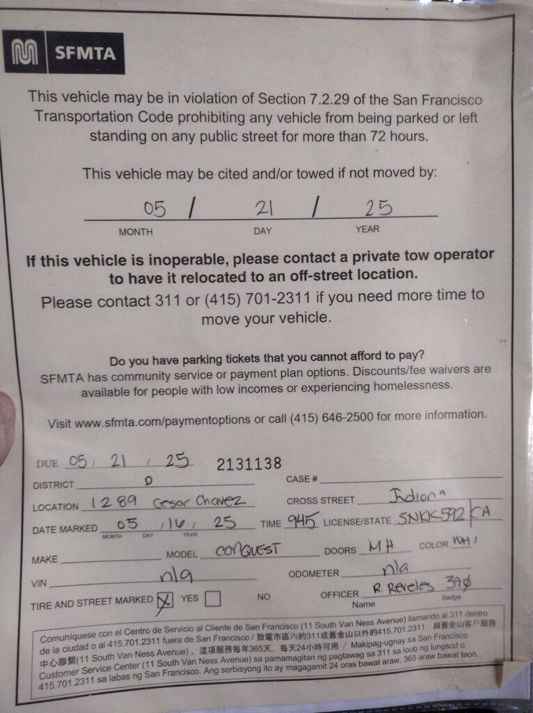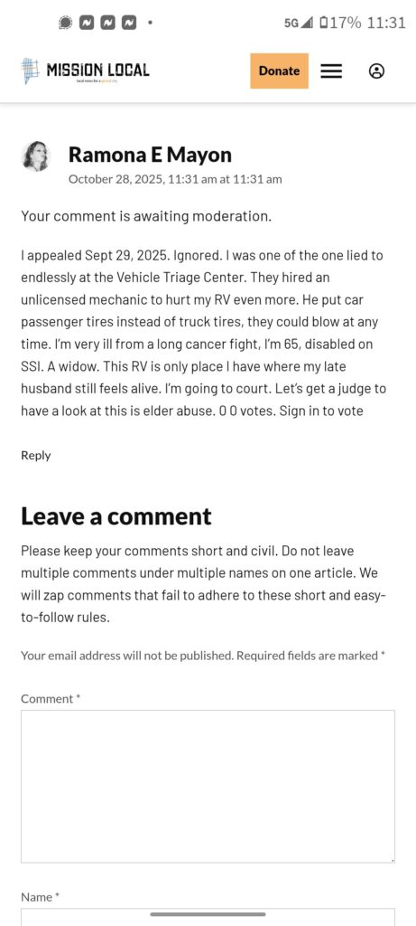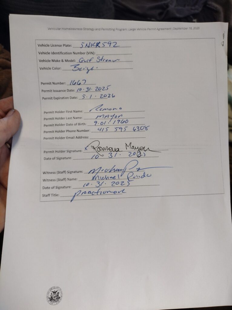 The new “Refuge Permit” program that the Dept of Homelessness/ SFMTA is “offering” is only for 437 of us here in month of May 2025 (counted by the police and put into a secret database they share). The email I got back once the website was (finally) up says I’m not on the list for a “Refuge Permit”. I appealed on Sept 29, 2025 and have heard not a word. I can prove RV was here month of May with several tickets, a 72-hour notice, and two FILMS of it being driven with street names showing. Yet I’m told in email that I’m not on the list for a “Refuge Permit” and they “strongly suggest” that I find “alternative parking arrangements “.
