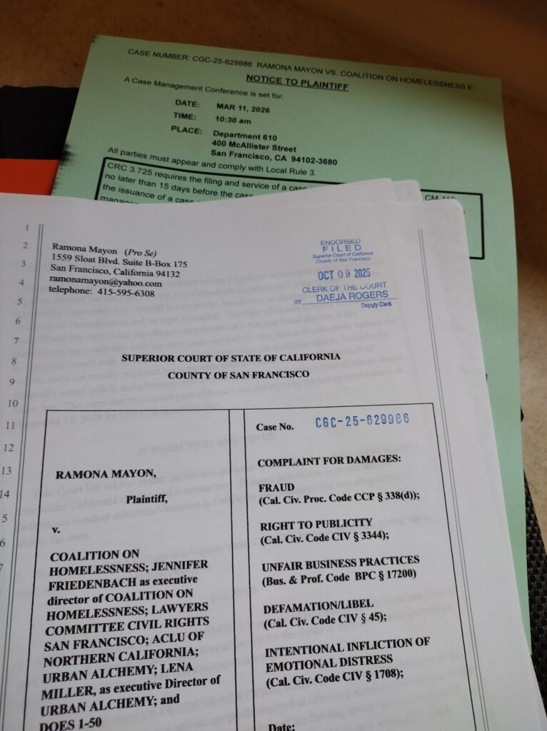 The media in the PDFs below (online Google Candlestick 35 ) which occured as a result of my forming a Tenants’ Union as a unified community protest at the horrific “Vehicle Triage Center” in 2023. The 2024 pro se litigation listed above as Mayon v Breed plus the appeal papers are about the site and its management by Urban Alchemy.