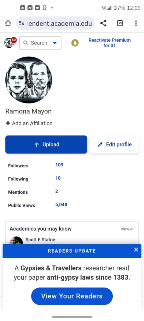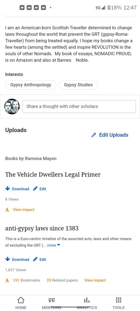 Above is my profile on Academia.edu where I was accepted as an Independent Researcher due to the sheer size of my white paper of hate speech against the Nomadic worldwide.