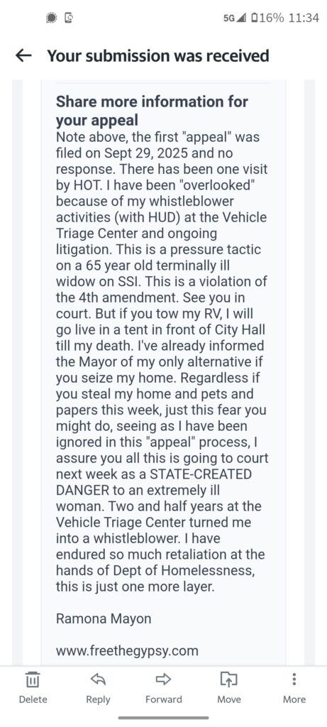 On Oct 9 and 22, 2025 I filed the above as the opening chapter of the story that began in 2020, a story about the way the Dept of Homelessness actually treats people they “serve”, and for which services, the taxpayer is forced to up millions, billions even, and for what?
