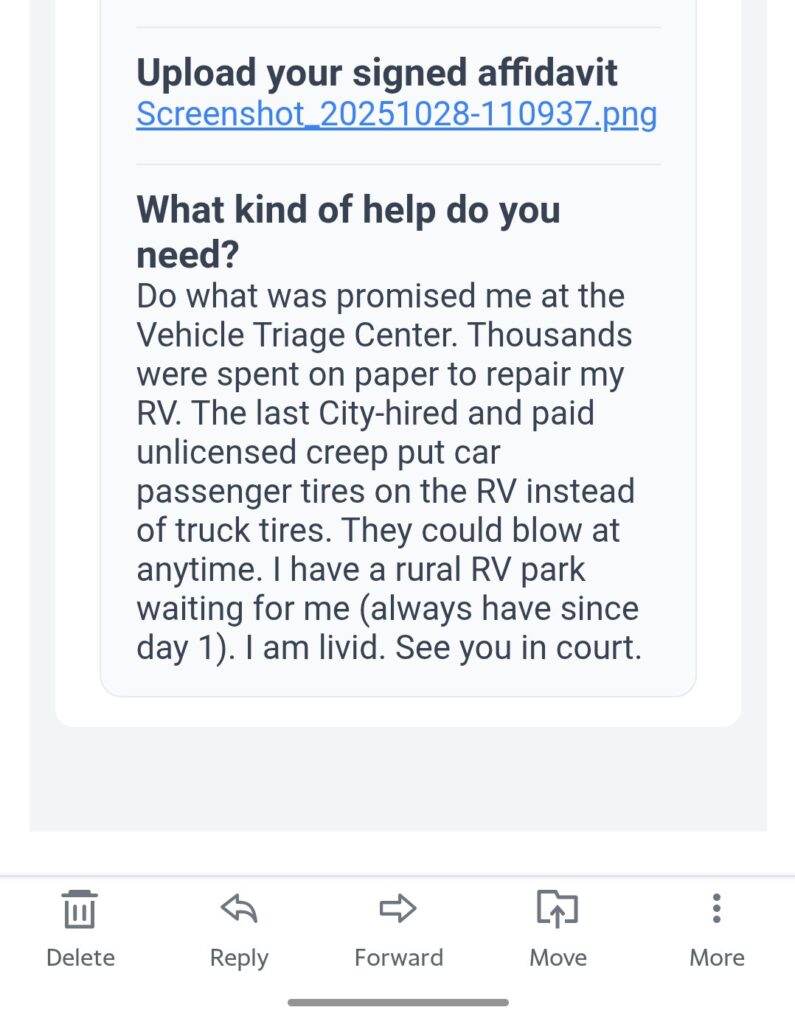 Funding is needed for ink, paper, and postage. Per the RV, I am still determined that the City will fulfill their (four-year) promise to do what is right by my RV repairs. That’s why going to court is, at this point, necessary.