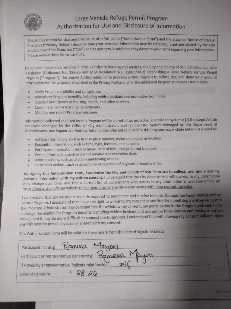 On January 28, 2026, at the office my (now-7th) Dept of Homelessness-appointed case manager, I had to put a smile on my face while I agreed to join the “RV Buyback Program”, but know I signed under coercion, because I have ZERO intention of relinquishing this RV. It was the last home I shared with my husband of 27 years, who died at the beginning of the pandemic (July 7, 2020) and he doesn’t feel dead in here. But I had to do so or the permit will be immediately revoked and it will be towed because I didn’t “cooperate”.