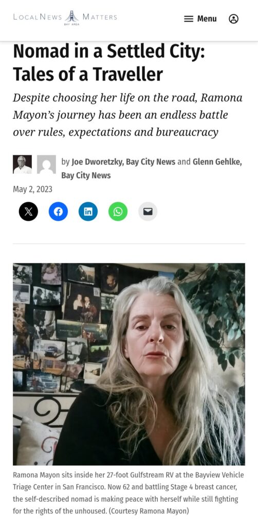 (2023) Profile about me while still in Urban Alchemy’s “Safe Parking”: https://localnewsmatters.org/2023/05/02/nomad-in-a-settled-city-tales-of-a-traveller/