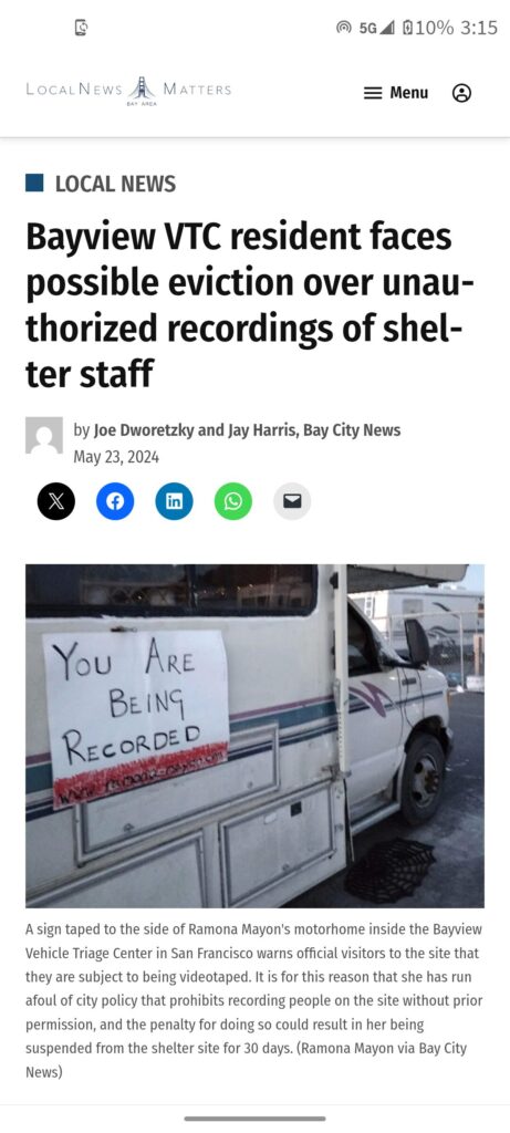 (2024) Article about me filming the conditions at the “Safe Parking” (I won the Arbitration hearing June 2024 and was NOT kicked to road for thirty-day punishment). https://share.google/gEK0yzfSZlFLVT0zj