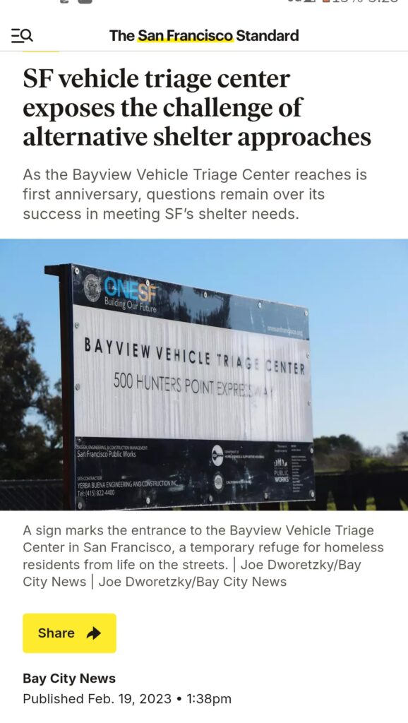 (2023) First in-depth article about San Francisco’s Dept. of Homelessness “Safe Parking” program run by Urban Alchemy and Bayview Hunter’s Point Foundation: