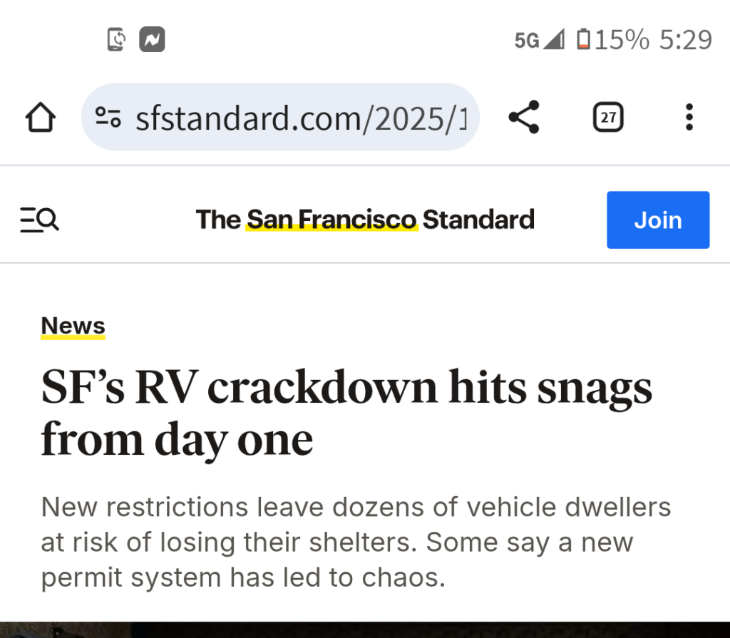 San Francisco hates its GRT (that’s what European parliaments and NGOs call us: gypsy-Roma-Traveller). It’s not just the RV ban and this ludicrous paper that says I agree with the City’s taking of my RV, there is also SFPD 97 that criminalizes me for eating or sleeping in my “house car” 10 pm to 6 am. That’s been in effect since April 1971 and it’s why the police believe it’s not a seizure under the 4th amendment to tow an RV on the spot, at their discretion. It’s also why Mayor Lurie decided he could ban an entire class of people from an American city. They have been treating us like this so long, they see nothing wrong in it.