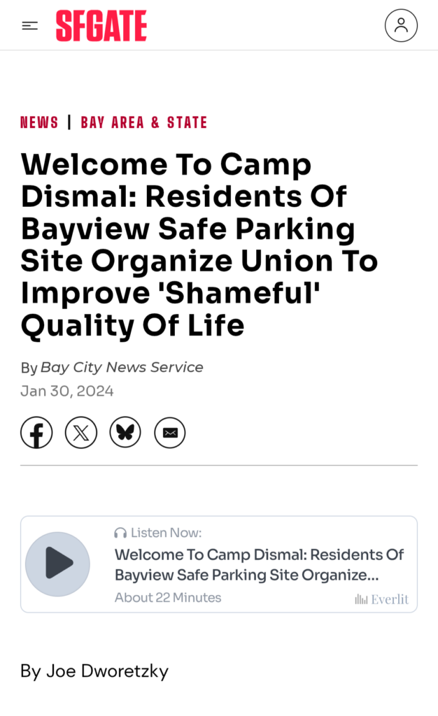 (2024) SF GATE article: Camp Dismal and our attempt to start a “tenants union” at the Vehicle Triage Center, which won 1st prize at 2024 SF Press Club for Digital Investigative Reporting (note: the above Profile by same journalist also won first prize in its category): https://www.sfgate.com/news/bayarea/article/welcome-to-camp-dismal-residents-of-bayview-safe-18638370.php