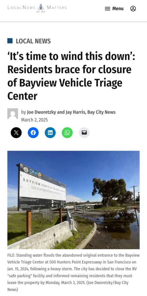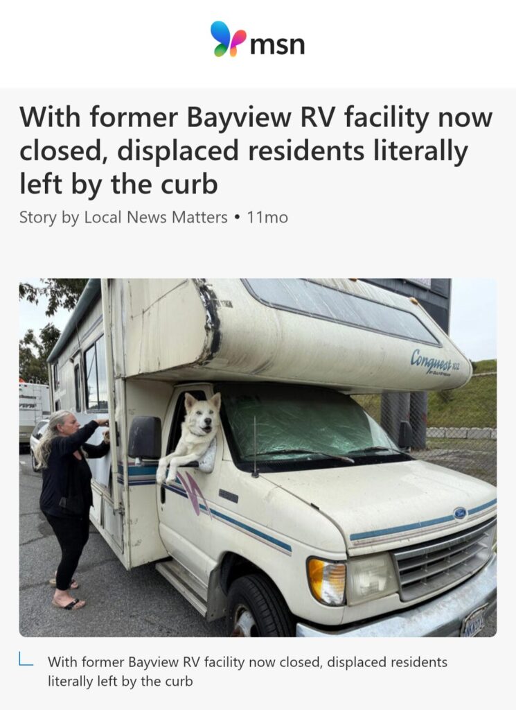 (2025) Article about the immediate days after the closure of “Safe Parking”: https://www.msn.com/en-us/news/us/with-former-bayview-rv-facility-now-closed-displaced-residents-literally-left-by-the-curb/
