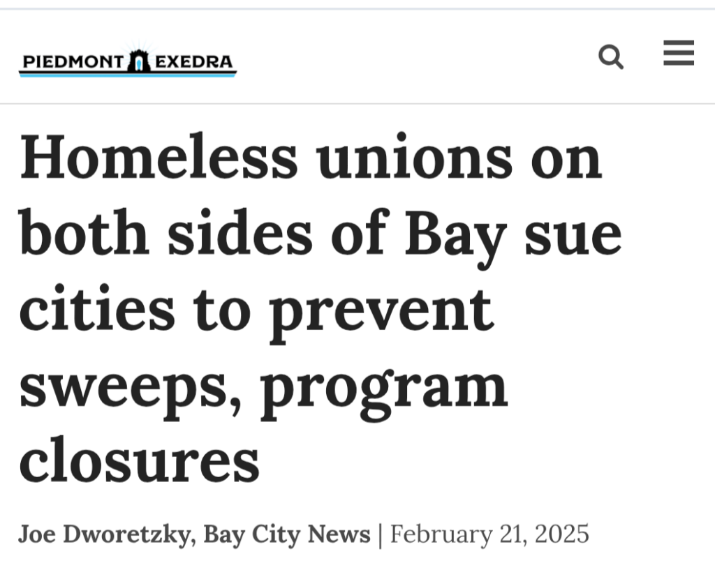 (2025) Article about the last-ditch effort to get help: https://piedmontexedra.com/2025/02/homeless-unions-on-both-sides-of-bay-sue-cities-to-prevent-sweeps-program-closures